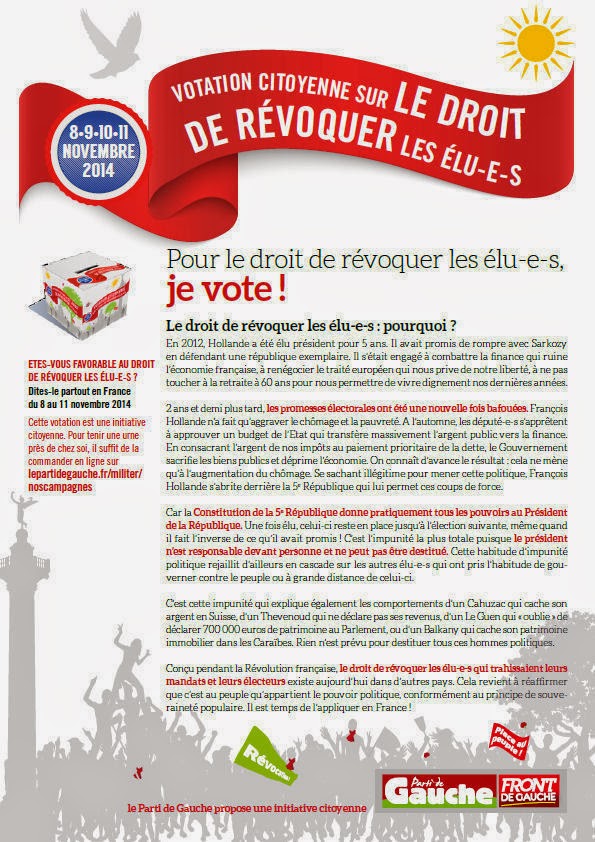 C’est pourquoi le PG a pris la responsabilité d’organiser du 8 au 11 novembre un grand week-end d’éducation populaire pour le droit de révoquer les élus au moyen d’un référendum révocatoire.